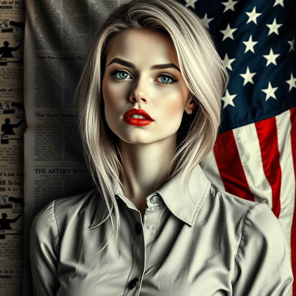 A striking fusion of fresco, realism, and pop art, featuring a stunning blonde woman with red lipstick in a collared Oxford dress. She is set against an old newspaper backdrop intertwined with an American flag, showcasing pops of blue, white, and red. This image captures black and white intimacy, reminiscent of the styles of Mike Deodato and Jan Frans van Bloemen. Her slender form exudes gentle lyricism and is richly detailed, inspired by tenebrism. Elements of emotional distortion bring depth to the scene, with influences from Anton Fadeev and Lauren Faust. The close-up composition echoes the lush, intricate style of Léon Bakst, rendered in an aspect ratio of 1:2 with a stylized essence of 625.