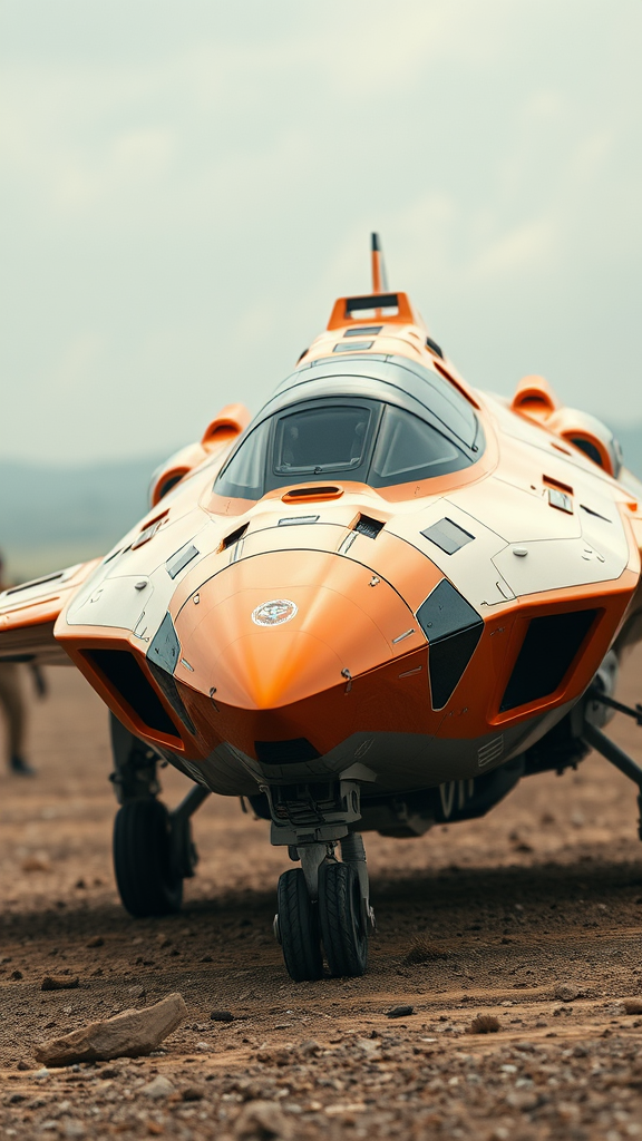 A striking futuristic spacecraft with sleek military jet features, adorned in a vibrant metallic orange accented by matte black and white details, exudes luxury and sophistication. Captured in an ultra photorealistic wide-angle shot at 8k sharp focus, the vessel stands ready in a battlefield setting, its fiery presence commanding attention. Despite its fierce appearance, hints of playfulness emerge with subtle nods to toy-like elements, encased in flowing lines and imperfect anatomy, reminiscent of a sci-fi influenced model. Wheels touch the ground, recalling a terrestrial aircraft, while the vehicle navigates an untamed warzone, blurring the lines between reality and imagination.