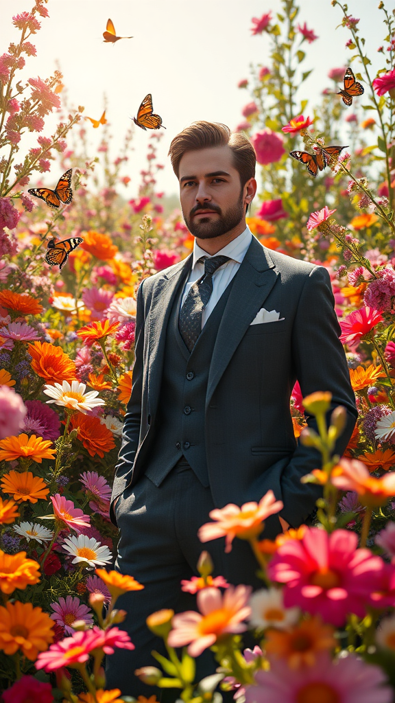 A striking gentleman stands amidst a vibrant garden teeming with blossoms, reminiscent of the lush artistry of Paulina Góra and the intricate floral compositions of Rachel Ruysch. The sun casts a gentle glow on the diverse array of flowers, each petal meticulously detailed and bursting with color, forming a vivid tapestry around him. The air is filled with the sweet aroma of nature, as butterflies flutter gracefully, drawn to the garden's vivid allure. The man's refined elegance blends harmoniously with the natural beauty surrounding him, creating a scene of serene tranquility and timeless charm.