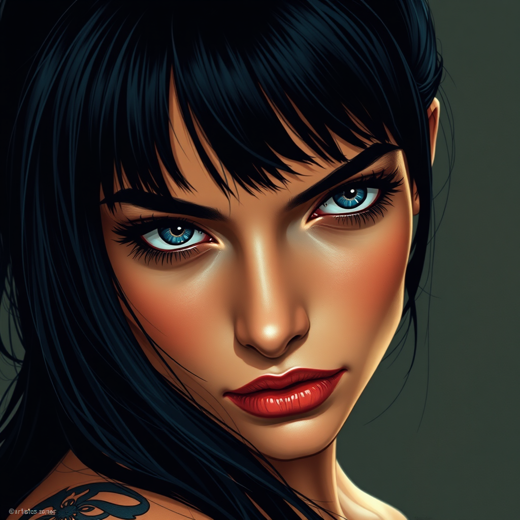 A striking girl with black hair and piercing blue eyes, adorned with a tattoo, comes to life in a visual style reminiscent of Patrick Nagel. The palette of dark orange and beige adds depth, and her detailed facial features capture an essence akin to Arthur Sarnoff's artistry. Crafted with precision, her image unfolds like a movie poster, infused with the blink-and-you-miss-it detail characteristic of Jon Foster, maintaining an aspect ratio of 63:128 with a stylistic intensity.