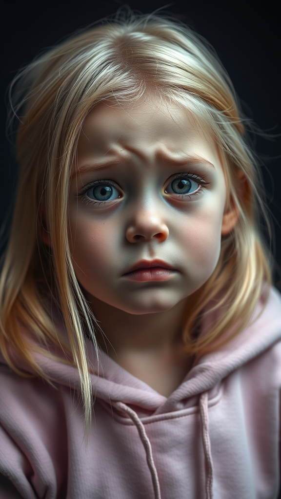 A striking, high-quality portrayal of an emotional young girl with golden blonde hair, tears glistening on her cheeks, her sorrowful expression deep and touching. She wears a soft pink hoodie that accentuates her youthful innocence, set against a rich, dark background that amplifies her vulnerability and the poignancy of the moment.