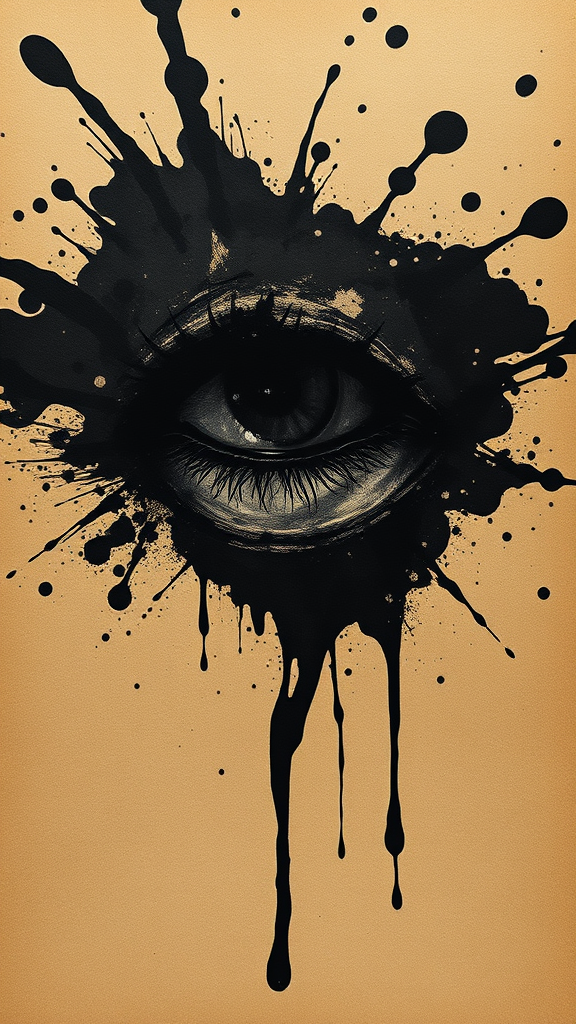 A striking illustration depicting a solemn eye drenched in splashes of dark ink on textured brown paper, embodying the essence of noir comic art and gothic black and white. This creation channels the dramatic contrasts of chiaroscuro portraitures with a touch of angura kei, merging the fluid forms of biomorphic art with the grandeur of monumental ink paintings. The style echoes the depth of oil painting techniques, capturing a haunting and enigmatic atmosphere.