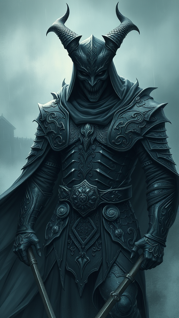 A striking illustration of a demonic warrior clad in intricately designed black medieval armor, with a masked face and flowing cloak, set against a backdrop of stormy weather and thick fog. The composition is epic, conveying a sense of pride and depth in a dark fantasy setting. The atmosphere is gloomy and dramatic, with emotional intensity, rendered in absurdres with maximum details. Influenced by the styles of Milo Manara and Russ Mills, the artwork is vivid and intricately detailed in 8k resolution. Noteworthy are the distinct characteristics that give life to this menacing figure, ensuring a captivating visual experience. Focusing on the art's unique elements, it maintains a sense of mythical allure and dark elegance, steering clear of elements like added text, watermarks, or deformities.