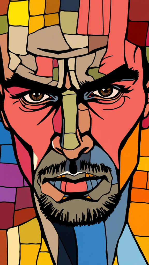 A striking illustration of a man's face, capturing a deep, intense gaze, crafted in a mosaic style reminiscent of Mondrian, featuring an array of vibrant, random colors. This artwork is defined by bold black outlines that form a mesmerizing pattern, creating a contemporary masterpiece.