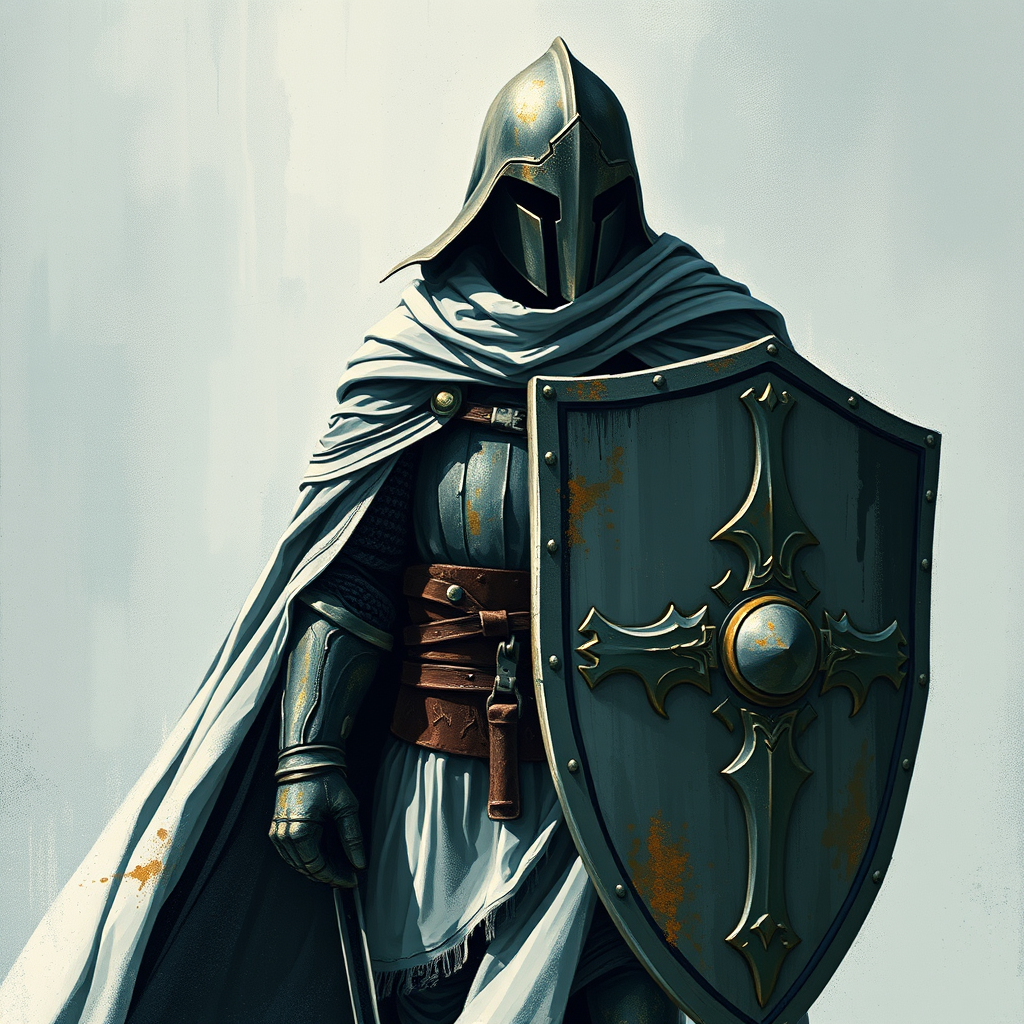 A striking illustration of a valiant knight adorned in a flowing cloak and sturdy shield, crafted in the adventurous pulp style, featuring a mottled texture with dark white and bronze hues. The artwork reflects the distinctive influence of Yup'ik art, with bold strokes produced by heavy palette knife techniques. The composition is infused with subtle shades of light indigo and green, evoking a dynamic feel from the 1970s to the present. The aspect ratio is tall and slender, emphasizing the knight's imposing presence and noble stature, enhancing the dramatic flair of the scene.