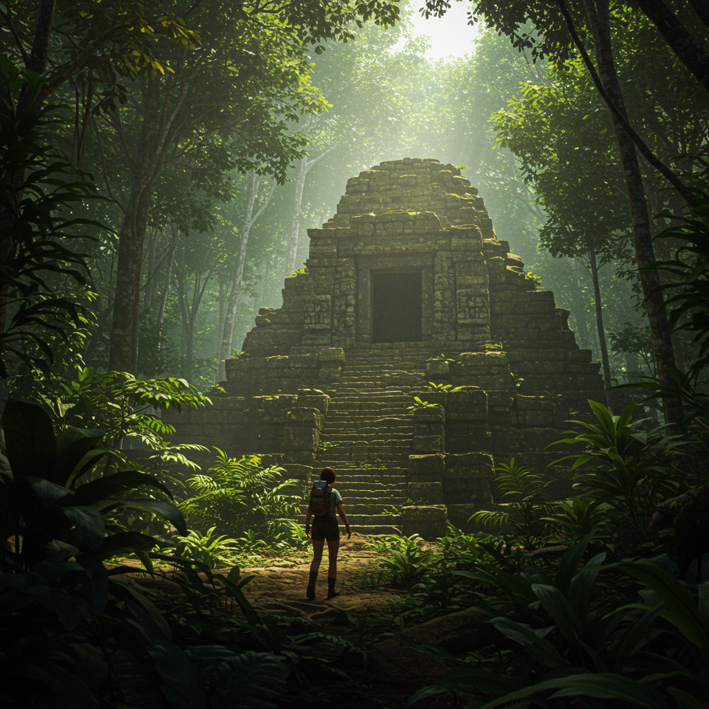 A striking image captures a 1980s female adventurer as she discovers an ancient temple ruin nestled deep within the lush jungle. The scene is marked by a volumetric atmosphere, drawing viewers into the heart of the jungle with its intricate and breathtaking beauty. The composition is centered, showcasing precise lineart and vibrant colors that emphasize the rich details of the temple and the surrounding foliage. This comprehensive cinematic portrayal evokes the artistic styles of Carne Griffiths and Conrad Roset, with dappled sunlight filtering through the canopy, adding a touch of ethereal magic to the scene. Despite the low resolution and occasional imperfections, such as blurred textures and textual errors, the essence of exploration and wonder remains captivating. This visual encapsulates the spirit of adventure, individuality, and the everlasting allure of ancient mysteries awaiting discovery.