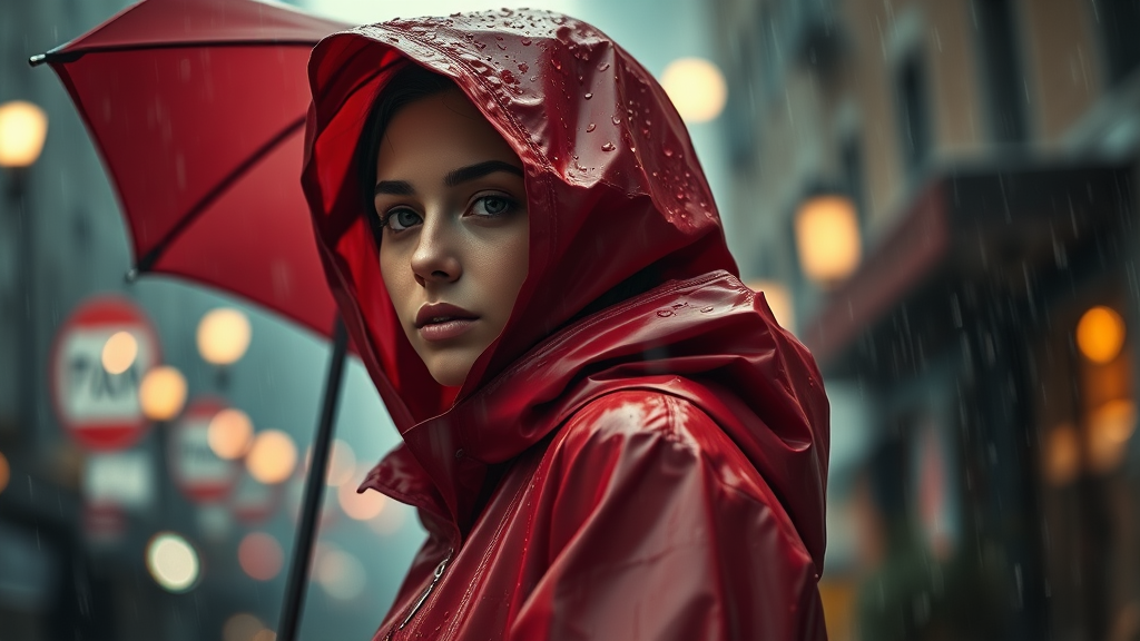 A striking image capturing a woman in a crimson raincoat, standing gracefully amidst a gentle rain shower. Rendered in photorealistic style reminiscent of Hedi Xandt, this captivating scene could easily feature on CG Society and Behance HD, showcasing intricate details and vibrant hues. The lighting and textures, enhanced by Redshift rendering, create a lifelike atmosphere, as if viewed through the lens of a Nikon D750. The woman's expression reflects a serene introspection, while subtle water droplets on her coat glisten against the soft, overcast sky. The surrounding environment of blurred urban lights adds depth and mood to the composition.