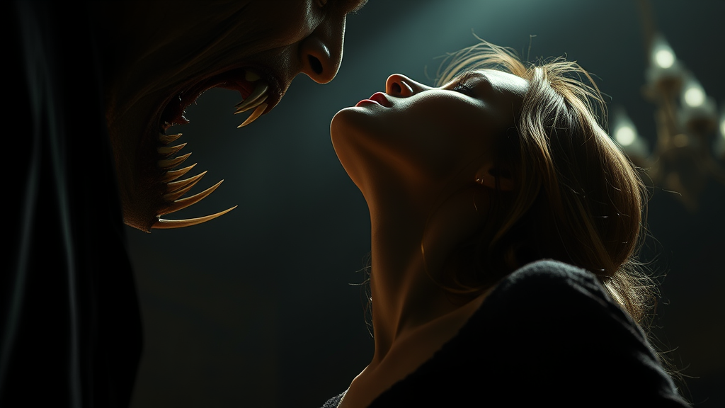 A striking image features a woman tilting her head back, her neck vulnerably offered to a looming vampire with ravenous intent. The scene is drenched in suspense through cinematic low lighting, casting dramatic shadows and brilliant highlights that heighten the eerie atmosphere. Each detail is captured in hyper-resolution, with an ultra-high definition that reveals every nuance. The dynamic tonal range and high dynamic range create a mesmerizing 8K masterpiece. The composition, with an aspect ratio of 7:6, adds to the tension and intimacy of the moment.