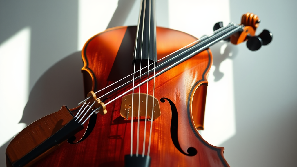 A striking image of a cello resting in soft, natural light, its rich textures highlighted against a minimalist white backdrop, captured using a Leica 50mm lens at f1.4 for a dreamy, shallow depth of field effect, with subtle artistic enhancements to accentuate the instrument's elegant curves and polished wood grain.