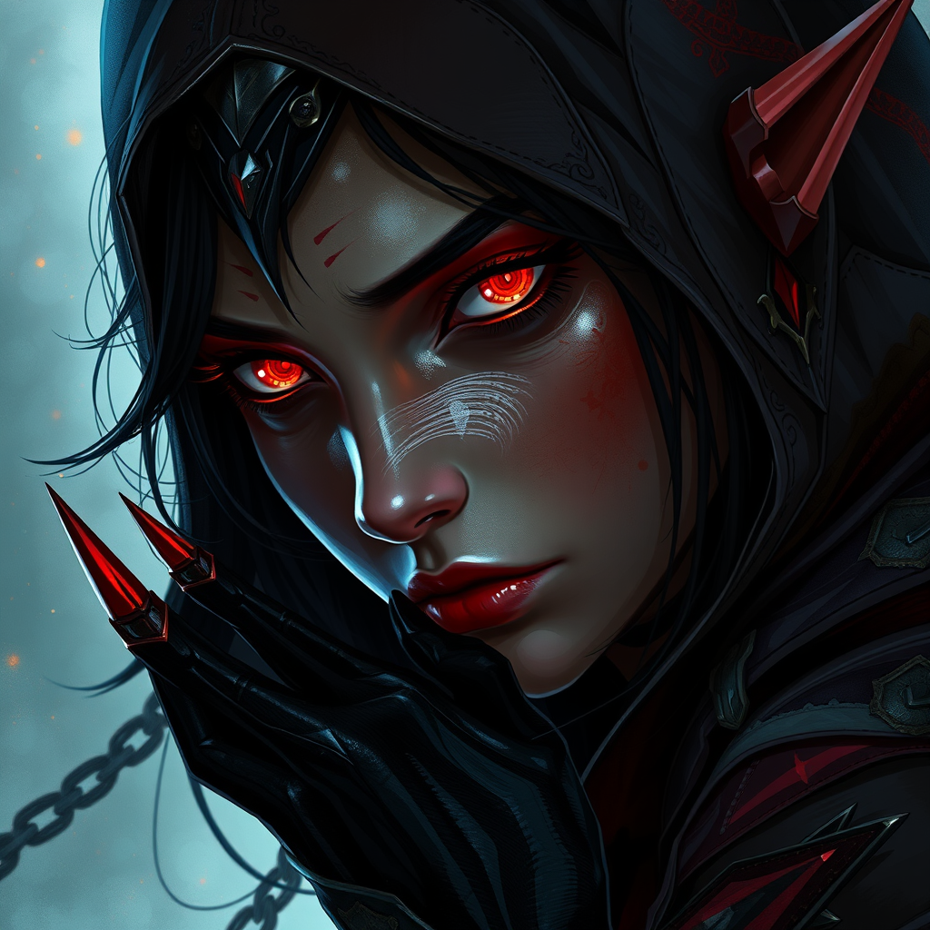 A striking image of a dark-skinned female elf assassin with piercing red eyes, depicted in intricate digital art. The illustration showcases a richly detailed fantasy character, blending the styles of Dan Mumford, Peter Mohrbacher, and Greg Rutkowski. The artwork is high resolution, featuring an elaborate composition with an ethereal backdrop that highlights the assassin's mysterious aura. Emphasizing vibrant colors and dynamic lighting, the scene captures the assassin’s grace and lethal elegance. The piece is trending on ArtStation, exemplifying the best quality and imaginative expression in art, with subtle modifications that enhance its captivating presence.