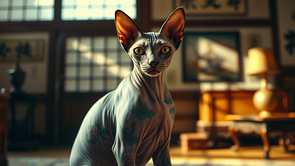 A striking image of a hairless sphinx cat exuding the aura of a yakuza boss, its skin adorned with vibrant irezumi-style tattoos. The cat sits proudly in a traditional Japanese room, the elegant decor reflecting its regal presence. The soft, warm light flooding the room casts gentle shadows, highlighting the intricate details of its colorful tattoos. Captured with a medium format camera, the photograph portrays an air of mystery and authority, blending the beauty of Japanese art with the unique charm of the sphinx cat.