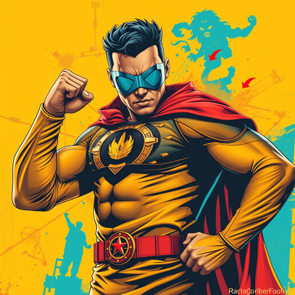 A striking image of a man dressed as a superhero, exuding confidence and strength, his fists and arm prominently featured. The artwork embodies the essence of Chicano art with vibrant dark yellow, turquoise, and accents of red and bronze. The style is reminiscent of bold, eye-catching posters, infused with elements of rangercore and the evocative charm of argus c3. The composition draws inspiration from the expressive energy of The Blue Rider movement, resulting in a captivating and dynamic visual piece.