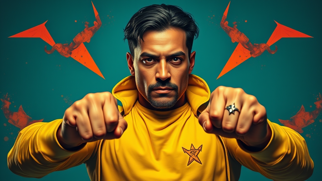 A striking image of a man styled as a superhero, his fists clenched with an air of determination, capturing the essence of chicano art. The color palette features deep dark yellow and vibrant turquoise, accented with bold hues of red and bronze. The composition is reminiscent of striking posters with a rangercore aesthetic, subtly nodding to the classic look of an Argus C3 camera capture. The atmosphere evokes the expressive spirit of the Blue Rider movement, blending dynamic artistry with a sense of bold empowerment.