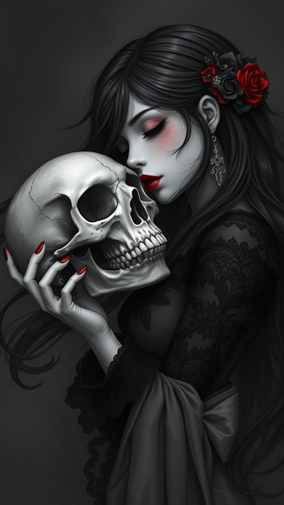 A striking image of a woman delicately kissing a skull, embodying the intricate style of Andreas Rocha with a fusion of Japanese-inspired art and gothic undertones. The scene is infused with a haunting realism, dominated by shades of gray and crimson. The woman's anime-inspired features are beautifully contrasted against the stark, monochrome backdrop. Her flowing hair cascades around her, blending seamlessly with the shadowy environment, while the skull's hollow eyes exude a mysterious allure. Subtle hints of crimson accentuate the woman's elegant attire, adding a dramatic flair to the composition. The piece is a mesmerizing blend of gothic elegance and ethereal beauty, capturing a moment of poignant intimacy.