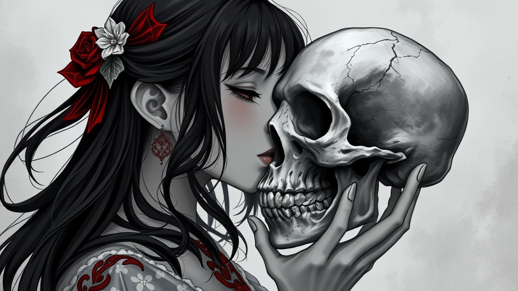 A striking image of a woman gently kissing a skull, merging Japanese-inspired art with gothic elements and a strong sense of realism. The scene features a palette dominated by gray and crimson, casting an ethereal yet haunting atmosphere. The woman's anime-inspired character design is meticulously detailed, with flowing hair and expressive eyes contrasting the stark, timeless visage of the skull. The composition is elongated, capturing the tender moment in a black and white portrait style, enhanced by subtle hints of color that evoke a sense of melancholy beauty. The overall aesthetic reflects the influence of Andreas Rocha's style, merging the fantastical with emotional depth.