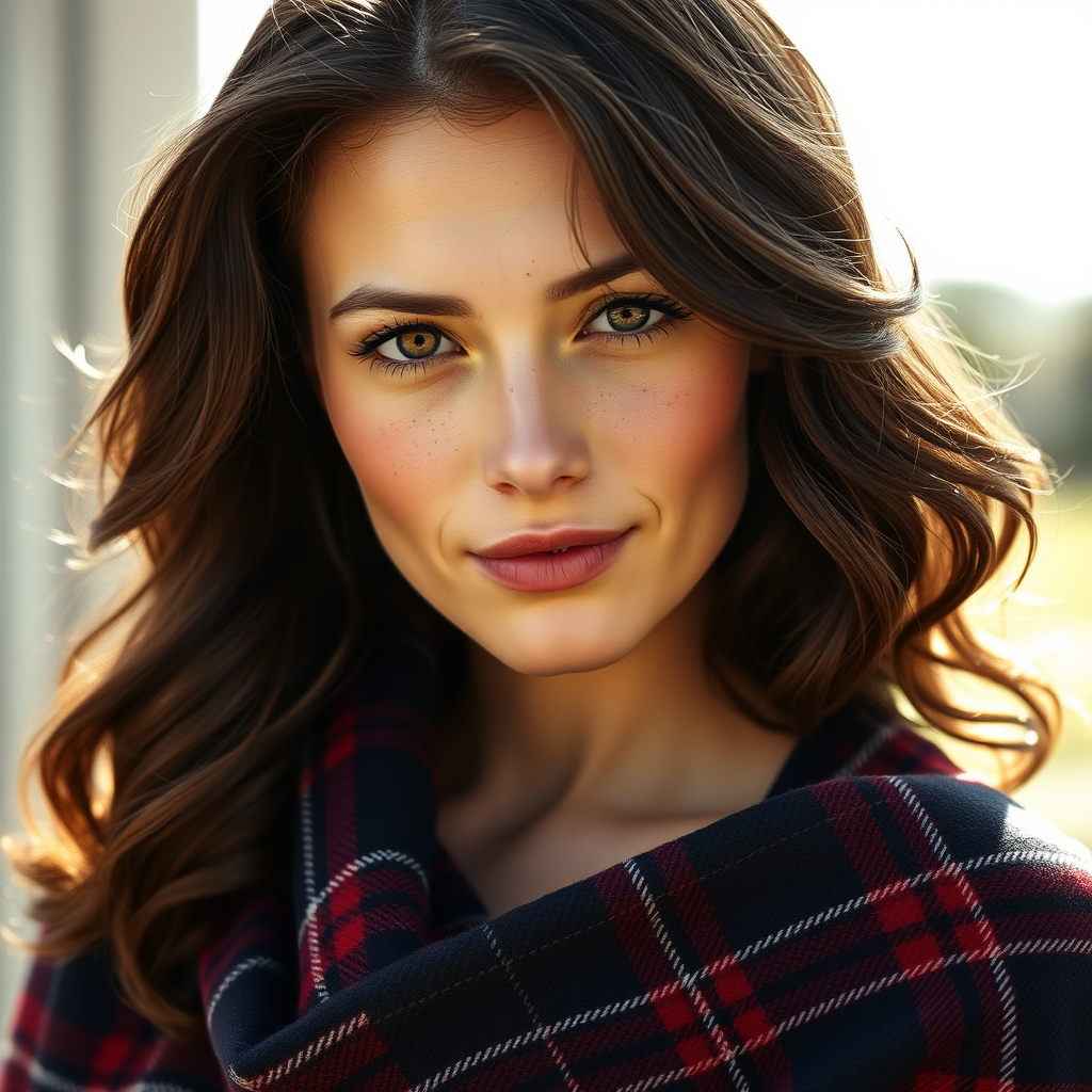 A striking image of a woman with dark, wavy brown hair cascading over her shoulders, her fair skin peppered with endearing freckles. Her amber eyes, filled with a warm intensity, gaze directly into the camera, exuding a mix of confidence and inquisitiveness. She dons a tartan plaid garment in deep navy blue and crimson, crisscrossed with fine white stripes, subtly slipping off her right shoulder. The scene is bathed in bright, natural light that enhances her features and creates a luminous backdrop.