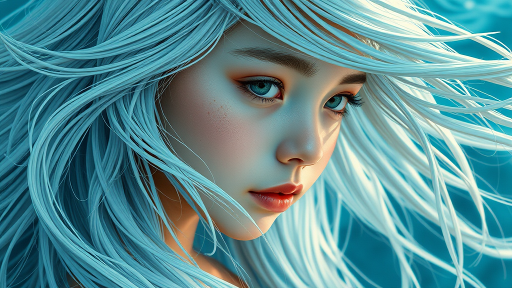 A striking image of a young girl with flowing white hair, capturing the essence of Ross Tran's vibrant art style, woven with hues of light teal and dark orange. Influenced by the intricate details of Guido van Helten's mural work, the scene is depicted in close-up shots, blending comic art aesthetics with the refined elements typical of realistic marine paintings. The creation pulsates with life, evoking the fluid dynamism of animated gifs, presenting a mesmerizing fusion of styles in an elongated aspect ratio.