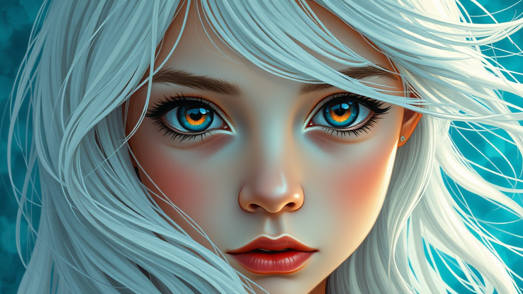 A striking image of a young girl with flowing white hair, her eyes an intriguing blend of light teal and dark orange. The artwork is reminiscent of Ross Tran's vibrant style, capturing the vividness of a comic art aesthetic. Her expression is beautifully detailed with the realism of Guido van Helten's mural techniques, offering a sense of storytelling within a single frame. The scene is enriched with elements of realistic marine paintings, adding fluidity and movement to the composition, while the image subtly shifts as if an animated gif, bringing her to life. The overall feel is dynamic and immersive, merging a contemporary art flair with classic illustrative techniques.