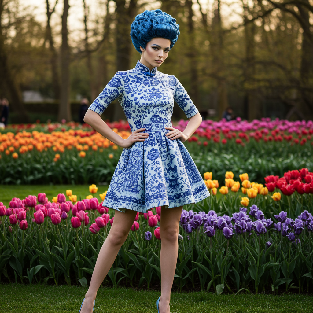A striking image of a young, professional fashion model with hair sculpted to emulate the glossy texture of blue and white porcelain Qinghua. She is poised gracefully, showcasing her full body and slender legs adorned in a short, avant-garde dress made from a material that mirrors the shiny blue and white porcelain Qinghua, taking inspiration from the visionary styles of Thierry Mugler, Manish Arora, and John Galliano. Set against the vibrant backdrop of a garden show bursting with fully bloomed spring flowers, the photograph captures the serene elegance of golden hour using a state-of-the-art mirrorless camera and a telephoto lens. Cinematic lighting casts a spotlight on her striking presence and the exquisite details of her ensemble, subtly enhanced with modern artistic interpretations of traditional motifs, creating a fusion of classic art and contemporary high fashion.
