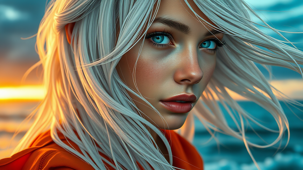 A striking image of a young woman with flowing white hair, designed in the vibrant and dynamic style of Ross Tran. Her eyes are an enchanting light teal, contrasting beautifully against her rich, dark orange attire. The artwork exhibits the refined detailing reminiscent of Guido van Helten's close-up compositions, blending the vivid storytelling of comic art with the depth of realistic marine paintings. This captivating scene unfolds like a moving animated gif, capturing the essence of an ethereal figure standing by an ocean at sunset, her hair mingling with the waves, evoking a sense of serene strength and mystique.
