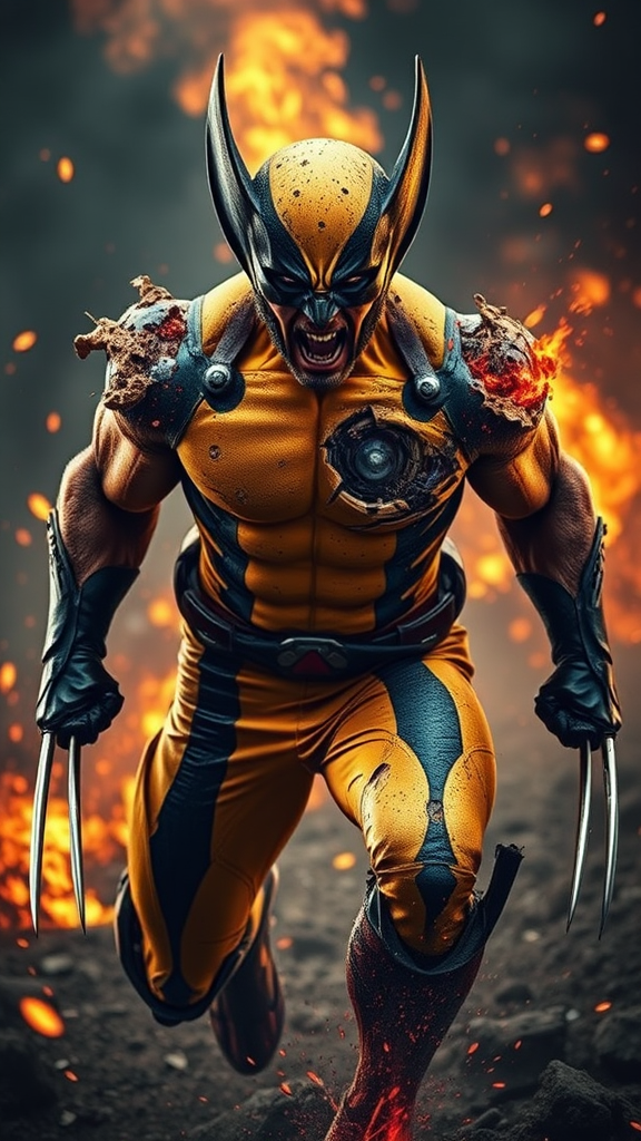 A striking image of Wolverine showcasing his regenerative powers in action, featuring a full body shot of an extremely damaged Logan charging towards the viewer. He appears to have risen from the ashes, with vivid depictions of his wounds healing dynamically. The style is surreal, highlighting the extraordinary nature of his abilities, capturing the raw essence of his indestructible spirit with an intense, almost otherworldly energy.
