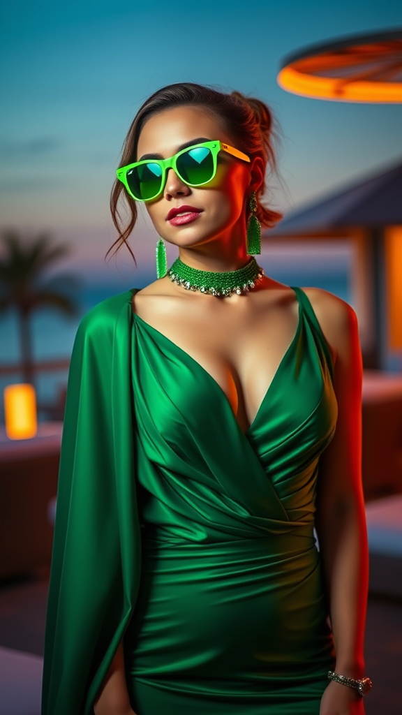 A striking image showcases a woman draped in an exquisite emerald gown, reminiscent of an upscale album cover with a nod to Elsa Bleda's artistic style. She sports a unique combination of Ray-Ban spectacles and vibrant neon sunglasses, injecting a burst of color into her ensemble. The dress, hugging her form flawlessly, features trendy color blocking patterns and is ideally suited for a sophisticated lounge setting. Complementing her attire, she adorns herself with matching green jewelry that highlights her outfit's elegance. This captivating shot was likely taken at a luxurious resort, effortlessly captured by the skillful photographer Julian Ope. The woman in the photograph evokes comparisons to musicians like Dua Lipa or actresses such as Stoya, with her distinct and memorable presence.