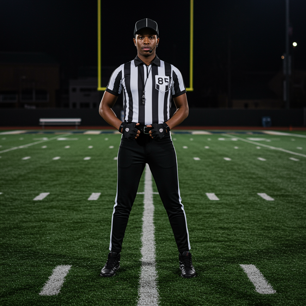 A striking individual dressed as a football referee stands confidently on the football field, exuding charm and poise. Positioned centrally, they lock eyes with the viewer in a captivating portrait that exudes authenticity. The scene is captured in ultra-realistic, high-definition photography, showcasing intricately detailed skin and features. The image benefits from soft, diffused lighting, creating a cinematic ambiance with a shallow depth of field and sharp focus. The artistry of the photograph emphasizes hyperrealism with CGI influences, achieved in high-resolution 8k detail. Elements such as low resolution, text, errors, and artifacts are absent, ensuring clarity. The composition avoids any distortions or unrealistic features, maintaining perfect anatomy and proportions throughout.