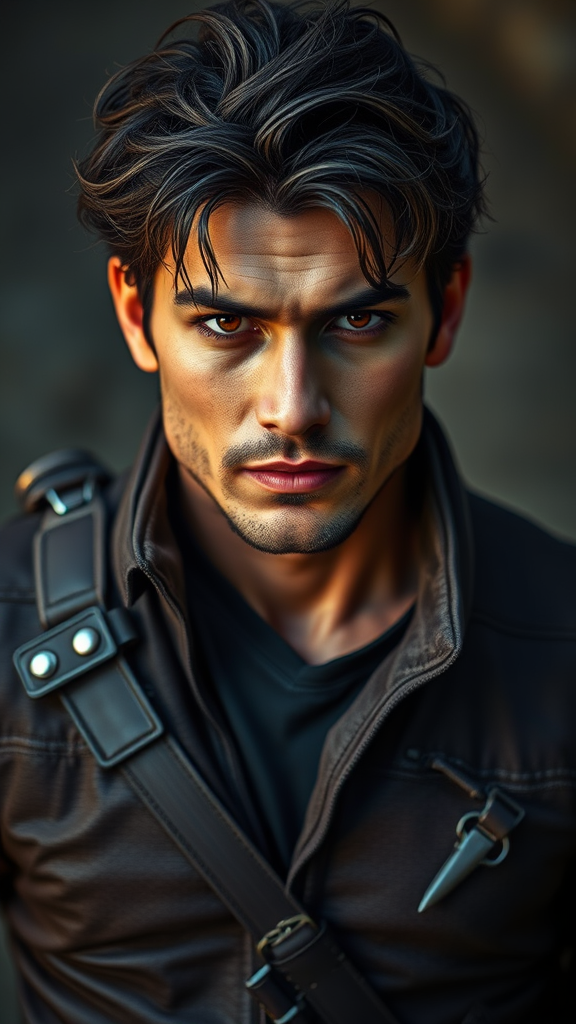 A striking individual dressed as an action hero, reminiscent of a charismatic adventurer, standing confidently at the center of the shot, their gaze meeting the viewer's. The composition focuses on a portrait style within a full-length frame, showcasing lifelike, intricate skin textures in stunning, realistic detail. Photographed with high-resolution clarity, the image utilizes soft diffused lighting and a shallow depth of field to create a hyperrealistic effect. With cinematic, 3D computer-generated imagery lighting, the sharpness is emphasized, capturing life-like realism. The visual maintains its focus on the central figure and avoids unwanted defects with careful composition, avoiding extraneous anomalies or visual distractions such as artifacts, incorrect anatomical structures, or poor quality elements.
