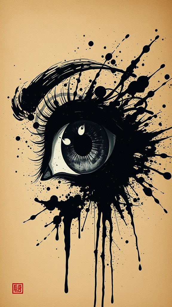 A striking ink painting of a solitary eye, splattered with abstract paint and stains on textured brown paper, drawing from noir comic art with a gothic black and white aesthetic. It combines the vivid, dramatic style of angura kei and the grandeur of monumental ink paintings. The piece possesses a chiaroscuro portraiture essence, with a biomorphic fluidity, reminiscent of classic oil painter techniques. The elongated 1:2 aspect ratio accentuates its dramatic flair, with an intricately stylized approach that captures the eye's haunting depth and mysterious allure.