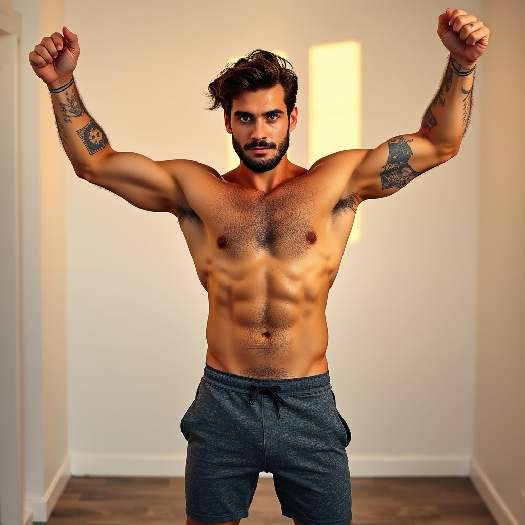 A striking Italian man with deep brown hair, a notably hairy chest, and defined abs stands confidently in an unadorned room with pristine white walls. His arms are raised, showcasing natural underarm hair and intricately tattooed arms. Clad in snug charcoal gray shorts, he exudes a sense of fitness and vitality. The warm glow of golden hour casts a gentle light on his full form, capturing the raw and unfiltered essence of this 2018 moment shared on Snapchat.