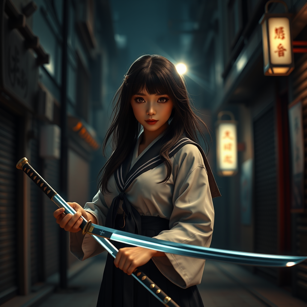 A striking Japanese female in a traditional school uniform stands poised with a gleaming katana in a shadowy urban alley, illuminated by the soft glow of flickering streetlights, cinematic, 3d render, crafted with the realism of a high-end engine, ultra-detailed, capturing every delicate feature and texture, 32k resolution, portrait orientation, infused with an expressive and dynamic style, subtly vibrant colors, dramatic shadows and highlights enhancing the scene's intensity, tranquil yet powerful.