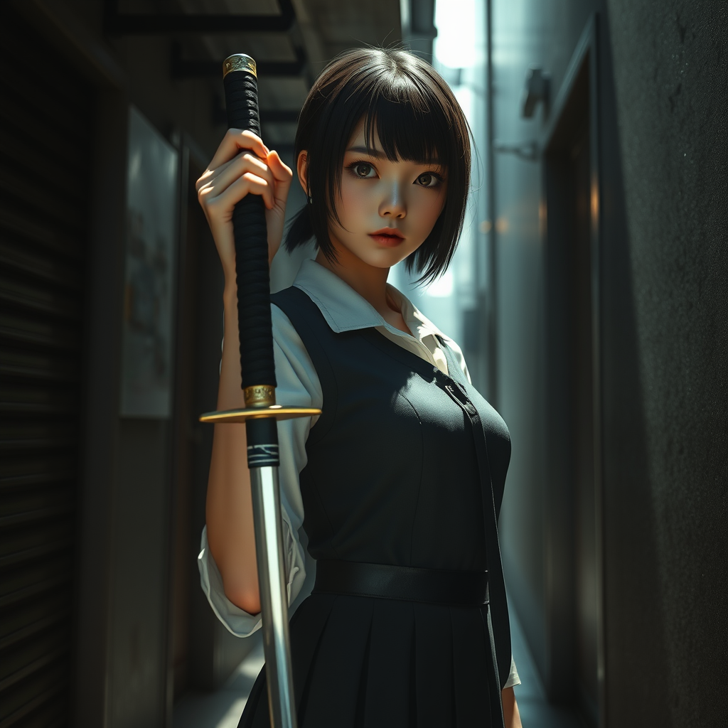 A striking Japanese girl with an air of mystery stands in a shadowy alley, dressed in a sleek school uniform, her hand gripping a gleaming katana with poise. The scene is cinematic and atmospheric, rendered in high detail with a 3D engine, capturing the interplay of light and shadow in this urban setting. The textures are lifelike, enhancing the mood with an expressive style that breaks convention, with an aspect ratio of 9:16, emphasizing the vertical grandeur of the setting.