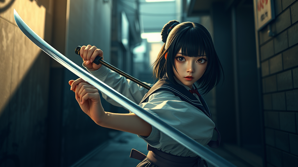 A striking Japanese junior high school girl, dressed in her school uniform, confidently wields a katana in a shadowy alley. The scene is cinematic and rendered with a high level of detail using advanced 3D technology, evoking a sense of realism akin to a scene crafted in Unreal Engine with 32k fidelity. The artwork embraces an expressive style, capturing the dramatic tension of the moment, with a vertical aspect ratio that enhances the immersive experience.