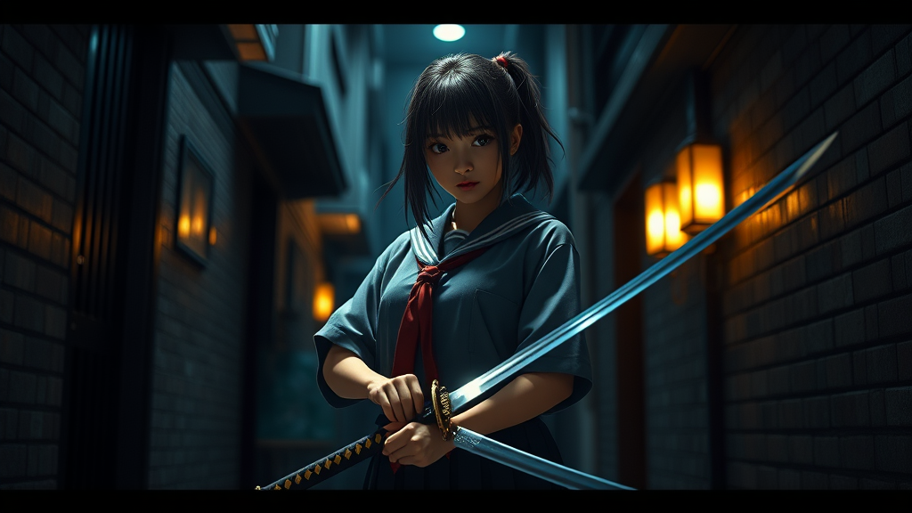 A striking Japanese junior high school girl stands poised in her uniform, gripping a glinting katana, her presence commanding in a shadowy alley. The cinematic atmosphere is enhanced by a high-definition, 3D render created with unreal engine, emphasizing dynamic lighting and intricate textures in a 32k resolution. The scene is framed in an imposing 9:16 aspect ratio, showcasing an expressive and vivid style with heightened details and a sense of tension in the air.