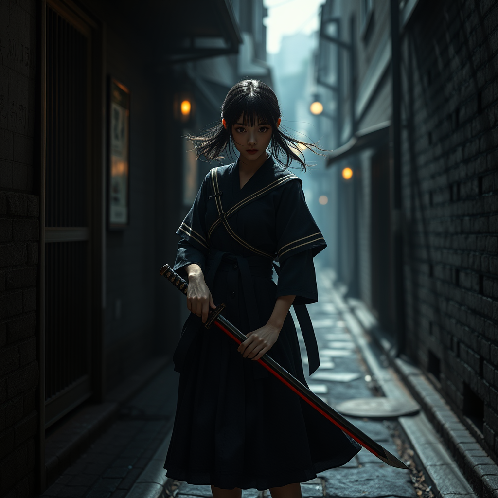 A striking Japanese junior high school girl with a katana stands poised in a shadowy alley, her school uniform subtly ruffled by the wind, captured with cinematic flair. The scene is a 3D render, crafted with unreal engine technology, highlighting intricate details and high-resolution textures at 32k. The ambiance is otherworldly, evoking a sense of mystery and intrigue with an aspect ratio of 9:16. The expressive style captures the tension and elegance of the moment, with a touch of fantasy that enhances the dramatic setting. The composition exudes a blend of youthful resolve and ancient spirit, her eyes telling a story of courage within the dimly lit corridor.