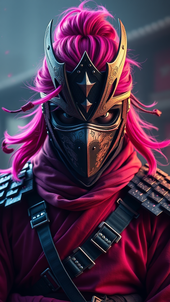 A striking Japanese ninja with vibrant magenta hair, wearing a traditional mask and formidable thick hide armor, captured in hyperrealistic detail. The scene displays photorealistic quality with astonishing 8k resolution, utilizing the power of Unreal Engine. Set in a dramatic vertical composition with expressive style elements, the character exudes an aura of mystery and grace, blending seamlessly with the vivid backdrop. The environment enhances the vivid colors and intricate textures, making the ninja's presence both commanding and ethereal.