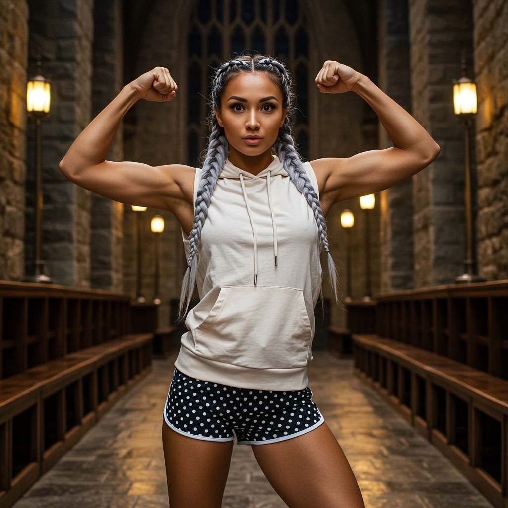 A striking landscape photography captures the essence of a 24-year-old Kazakh-Hungarian female, a confident CEO with a challenging head tilt expression. Her body showcases a visible ribcage accentuated by smooth, golden brown skin with a natural glow, clearly visible pores, and texture that shine, especially after a sun-kissed day. Defined and toned muscles highlight her physique, along with her flat chest and small breasts. Her large, pill-shaped honey eyes are bright and captivating, framed by long, elegant eyelashes that draw attention. Her metallic silver hair is styled in intricate Dutch braids, complementing her sculpted brows and delicate facial features. Dressed in a sleeveless hoodie and polka dot shorts, she exudes both strength and style. Positioned on the left side of the frame by the rule of thirds, she strikes a victory pose. The backdrop of this compelling portrait is the majestic Hogwarts Great Hall, with its magical ambiance amplified by strategically placed light boxes. The model herself is bathed in soft, natural lighting, evoking the artistic style of Paulina Olszynski.