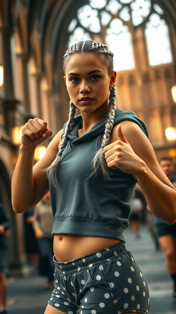A striking landscape photography scene features a confident 24-year-old Kazakh-Hungarian female CEO with a challenging head tilt expression. Her physique reveals her fitness-focused lifestyle, displaying visible ribcage and smooth, well-defined muscles, including toned abs. Her skin, a golden brown with a natural glow from sun exposure, showcases clear pores and texture that are sharply in focus. Her large, pill-shaped eyes are a clear honey color, enhanced by long, elegant eyelashes. She sports metallic silver Dutch braids, perfectly complementing her sculpted eyebrows that frame her delicate features. She is dressed in a sleeveless hoodie and midriff-baring polka dot shorts, striking a victory pose. Positioned on the left side of the frame using the rule of thirds, the background is the enchanting Great Hall of Hogwarts, softly illuminated by light boxes. The model is bathed in soft natural light, echoing the style of Paulina Olszynski.