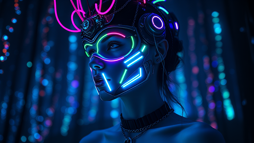 A striking long-shot full-body portrait of a woman gazing into the distance, embodying a stunning blend of lucid weirdcore and cybercore aesthetics. Her bioluminescent, intensely glowing biomechanical features emerge from her skin, intricately detailed with marginalia embellishments to form an elaborate headdress. Her visage is partially concealed by a mask crafted from fiber-optics, with bright neon lights that radiate vibrant colors—blue, green, and purple—resulting in a mesmerizing and otherworldly appearance. The setting is a glowing forest, transformed into a vivid neon wonderland dreamscape filled with particles of luminescence in shades of blue, green, and purple. Crafted with meticulous attention to photorealism, the composition follows the principles of the rule of thirds and the golden ratio, featuring raytraced shadows and an engaging depth of field. The scene is laid out asymmetrically with hypermaximalist detailing, and the render achieves cinematic realism using an octane engine, enhanced by unreal engine technology, presented in breathtaking 8k resolution.