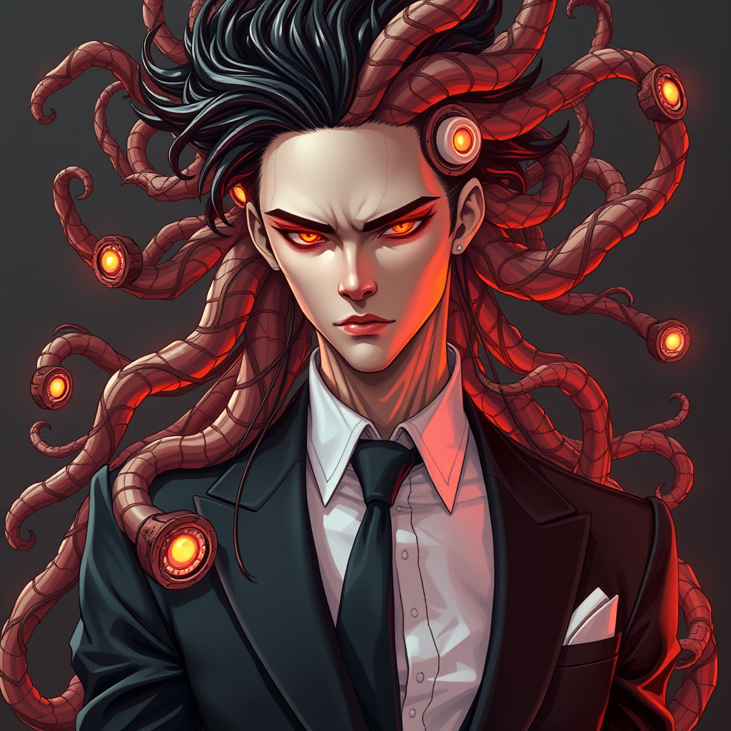 A striking male anime character with organic tendrils reminiscent of Giygas, embodying the essence of a forest druid dressed in a sleek business suit. This ultra-realistic illustration showcases a retro-futuristic male cyborg, merging punk art aesthetics and robotic features into a true masterpiece. The artwork is highly intricate and detailed, with sharp lines and a fusion of Giygas's organic and technological elements, including mesmerizing rings. Inspired by the works of James McCarthy, Beeple, and Johfra Bosschart, the character design is steeped in the style of Ayami Kojima, rendering a highly detailed painting with the finesse of a 3D render created in Unreal Engine. The piece unfolds like an intricate abstract nouveau, adorned with filigree scrollwork, and crafted by artists like Tooth Wu, WLOP, and Dan Mumford. Conceptualized as trending art on ArtStation, the illustration is rendered with Octane to achieve cohesive and symmetrical artwork that is cinematic and serves as key art. The hyper-realistic 8K render boasts iridescent accents akin to the character Albedo from Overlord, reflecting the opulence of a library of gems. The meticulous detail and abstract intricacies of the piece echo the distinct styles of Tooth Wu, WLOP, Beeple, and Dan Mumford, culminating in a visual feast that stands out in contemporary art forums like ArtStation, characterized by Greg Rutkowski’s approach to symmetric and coherent artwork.