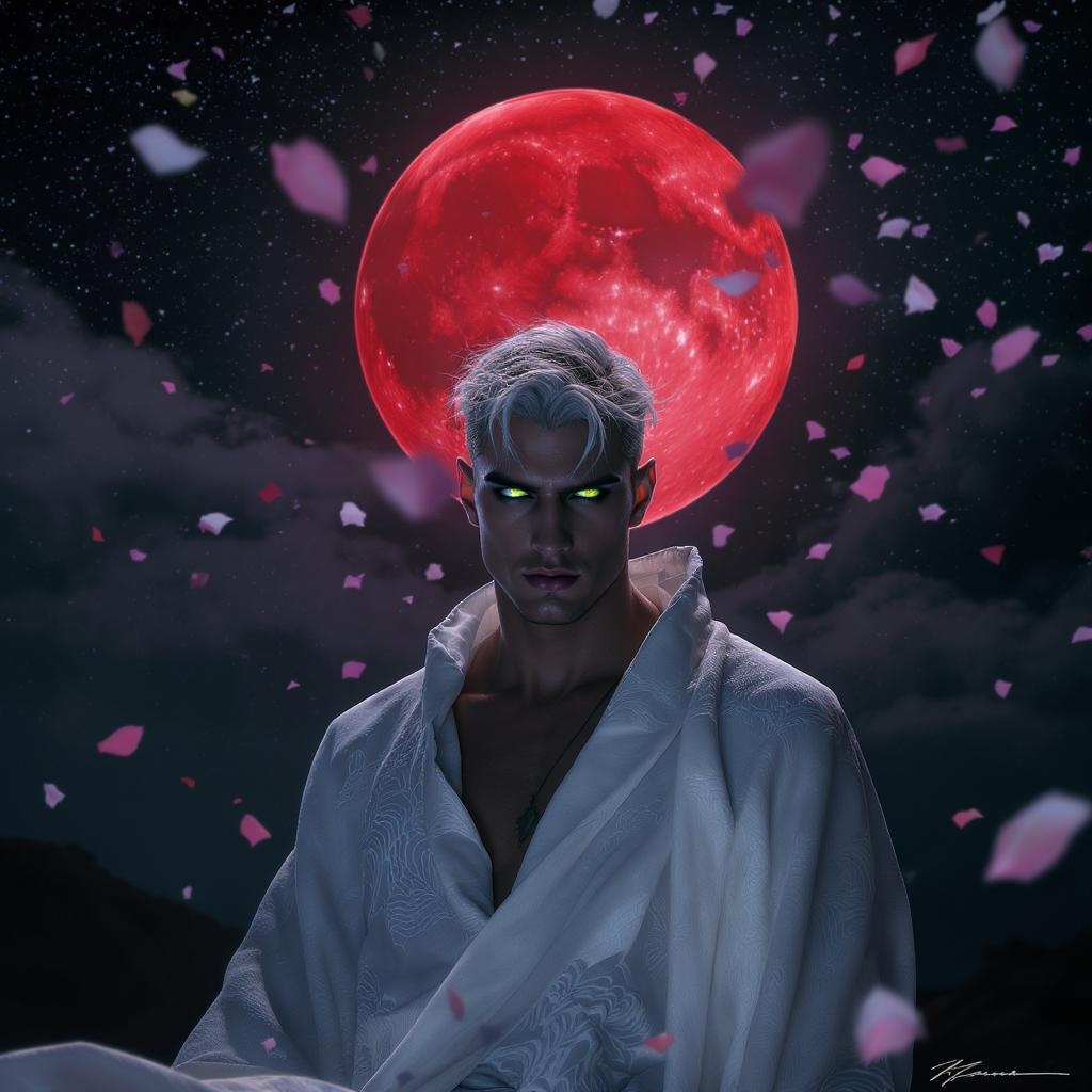 A striking male figure with intense green eyes and short silvery hair stands under a blood-red moon. He is clad in a flowing white robe that catches the moonlight, its fabric shimmering ethereally. The night air is thick with petals dancing around him, their delicate forms contrasting the dramatic sky. Captured in a front portrait shot with a shallow depth of field, the side lighting accentuates his strong features while the moon casts a celestial glow, illuminating the scene with an otherworldly clarity. The image radiates an 8K masterpiece quality, uniting strength and serenity in a luminous display.
