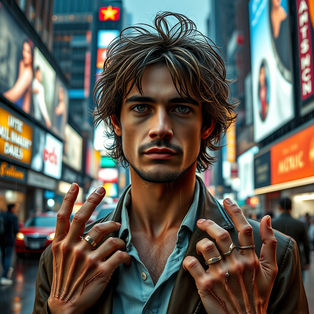 A striking Mediterranean man stands confidently in rainy Times Square, medium messy hair framing his perfect symmetrical face, bright eyes glistening with highlights. He wears a retro outfit amidst the bustling, neon-lit scene. Despite an attempt at elegance, the scene is unsettling with deformed elements: fragmented limbs, disfigurations, extra fingers, and oddly proportioned hands. His appearance, distorted by unusual proportions, includes a long neck and fused fingers, lending an eerie aura to his confident stance.