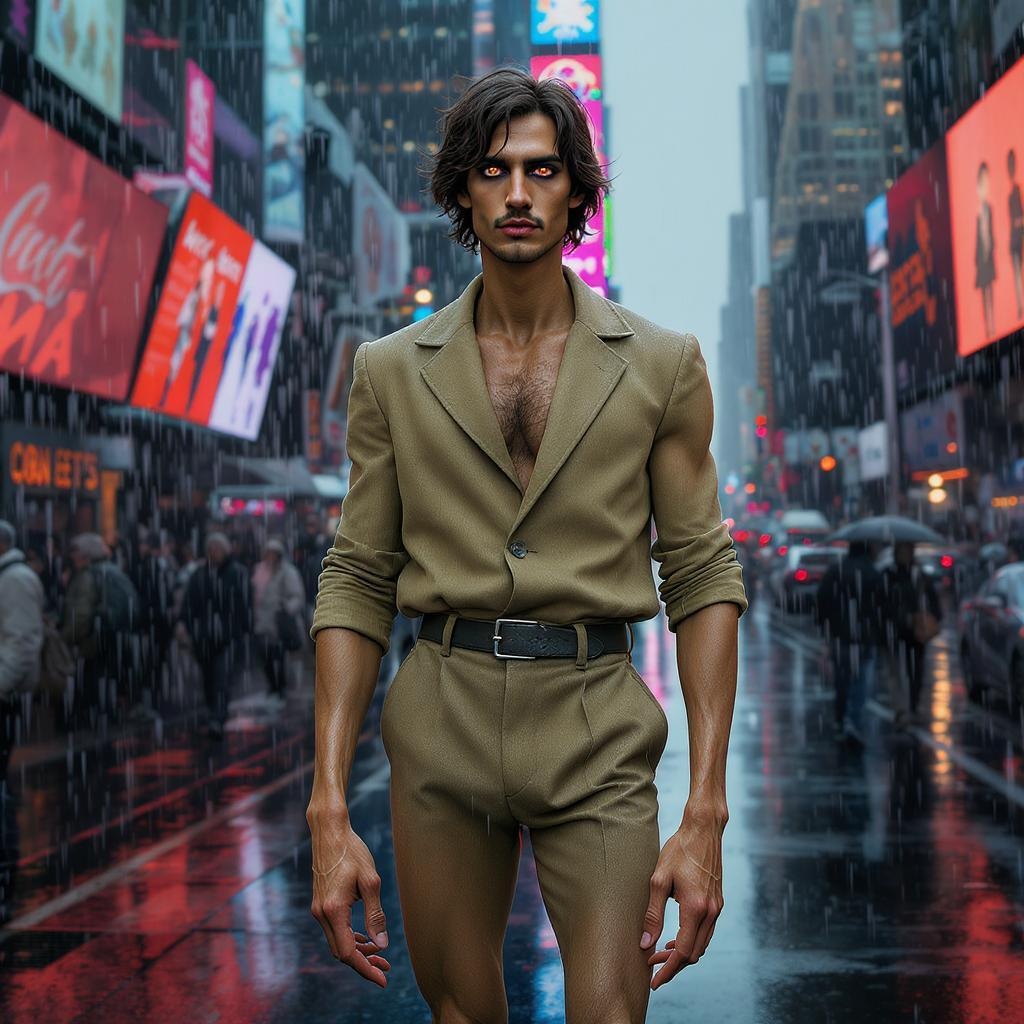 A striking Mediterranean man stands confidently in the rain-soaked streets of Times Square, his messy medium-length hair framing a perfectly symmetrical and captivating face. His bright eyes seem to capture the light around him, providing an intense focus amidst the chaos. Clad in a retro outfit, his presence is commanding yet disrupted, as though distorted by an unseen force. Limbs appear elongated and strangely fused, with additional fingers and incongruous proportions giving an almost surreal aspect to his silhouette. His face, though handsome, is marred by an oddity that borders on the disfigured, where traditional beauty and unsettling elements collide. A long neck adds to the elongated and slightly distorted appearance, reinforcing a reality slightly off-kilter, encapsulating an enigmatic blend of allure and the bizarre.