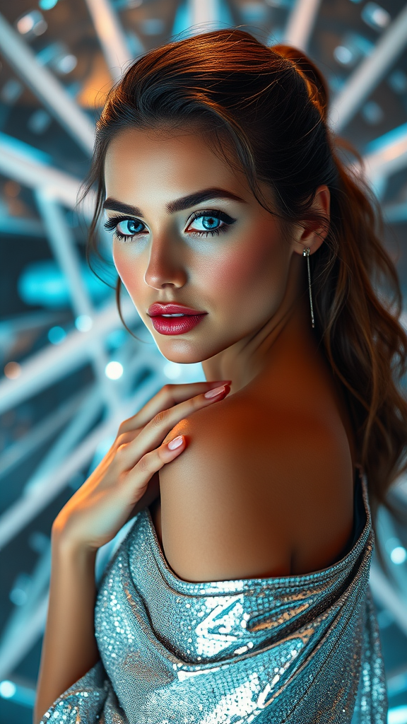 A striking model with bright azure eyes, draped in a shimmering silver gown, captures the essence of futurism as she poses amidst a backdrop reminiscent of a tesseract, echoing a high-fashion Dior campaign vibe. Her features possess an ethereal allure akin to Miranda Kerr, with the setting styled in a contemporary CG Society trend, exuding elegance and innovation.