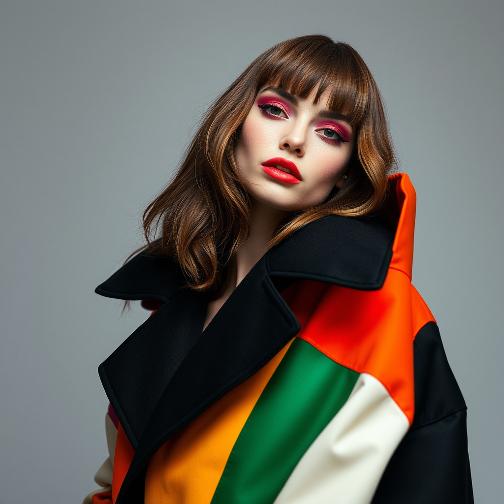 A striking model with chestnut brown hair and playful bangs, adorned with vibrant, avant-garde makeup akin to a high-fashion editorial spread. She is draped in an oversized, stylish color block coat, exuding a bold and contemporary flair against a minimalist background, capturing an essence of modern elegance and artistic expression.