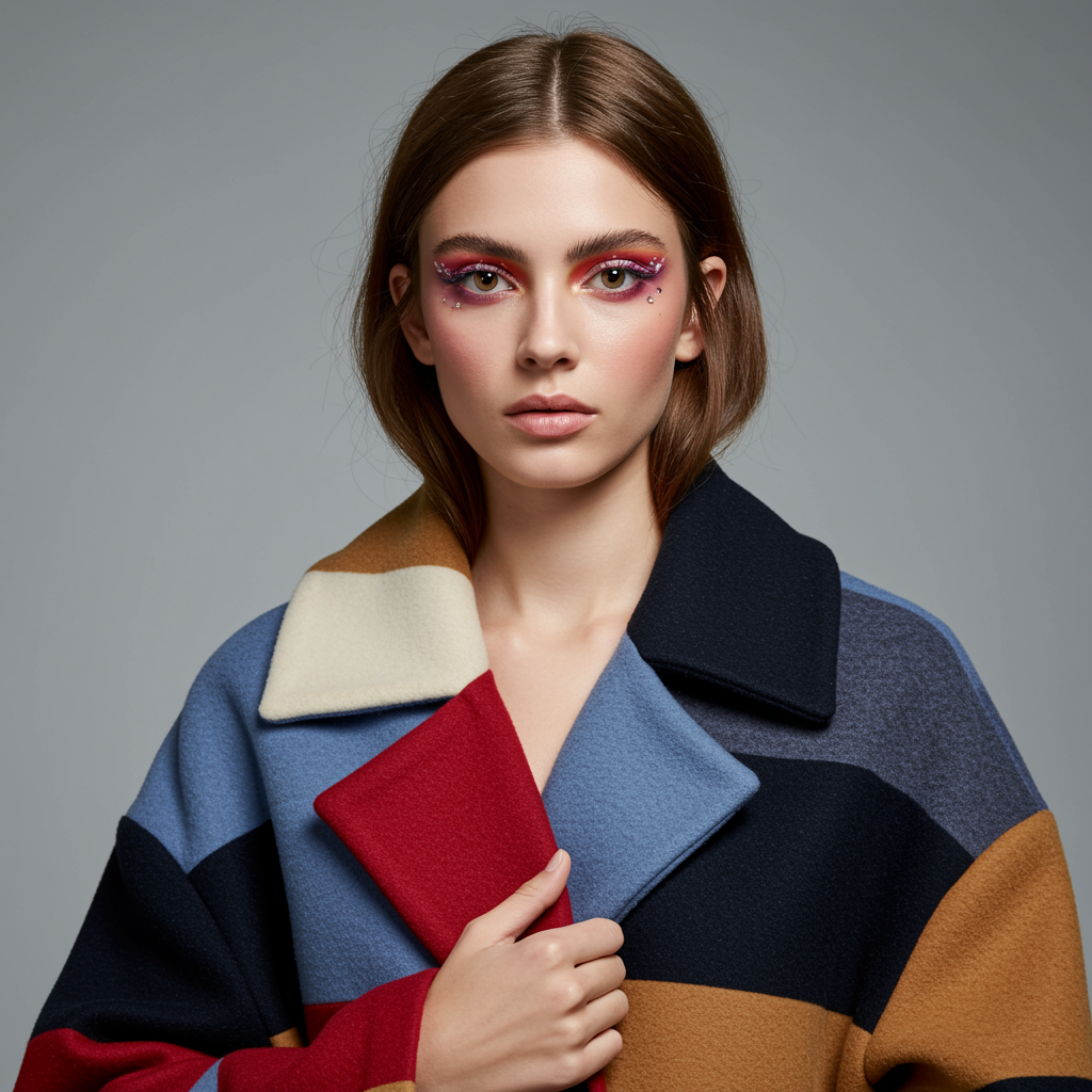 A striking model with chestnut brown hair and soft, wispy bangs, showcasing vibrant and artistic makeup reminiscent of a high-fashion beauty editorial, draped in an oversized coat featuring bold color block patterns, set against a minimalist backdrop to emphasize the avant-garde ensemble.