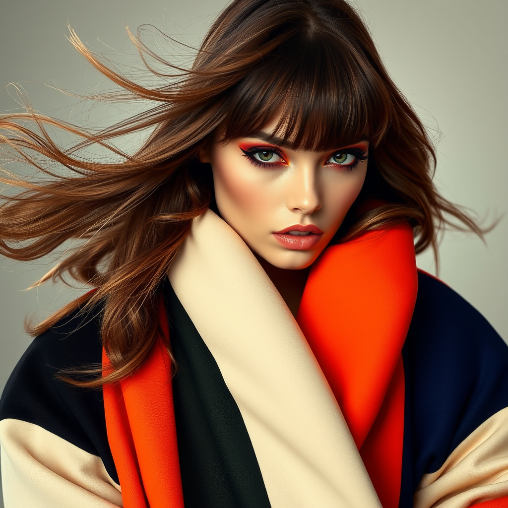 A striking model with flowing brown hair and bold bangs, showcasing vibrant and artistic makeup reminiscent of a high-fashion editorial spread. She is elegantly draped in an oversized coat that features an eye-catching color block pattern, capturing the essence of avant-garde beauty styling for a leading fashion magazine. The scene is set against a minimalistic backdrop, highlighting the model's dynamic expression and the coat's vivid colors, creating a captivating visual narrative.