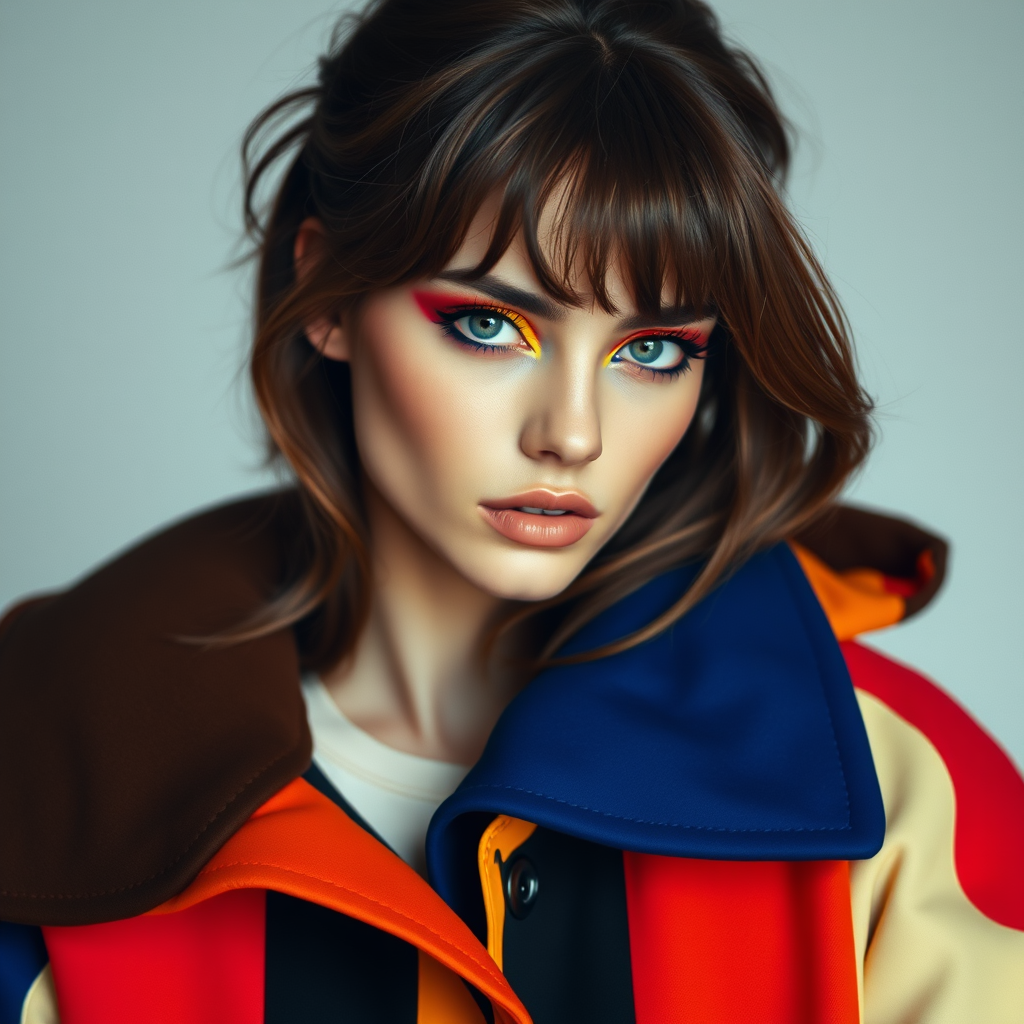 A striking model with lush brown hair and stylish bangs, showcasing vivid, colorful makeup reminiscent of an avant-garde fashion editorial for a beauty magazine, clad in a voluminous, oversized coat with bold color-block patterns.