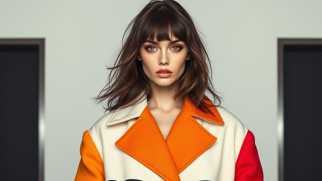 A striking model with rich brown hair and playful bangs, adorned with vibrant, artistic makeup reminiscent of an avant-garde editorial fashion shoot. She confidently wears an oversized coat featuring bold, contrasting color blocks, each shade adding a dynamic flair to the ensemble, set against a sleek, minimalist background that enhances the modern aesthetic of the beauty magazine theme.
