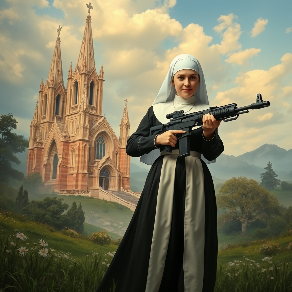 A striking nun brandishing a formidable machine gun stands amid an enchanting landscape, with a majestic cathedral as a backdrop. The scene exudes an ethereal fantasy, blending elements of surrealism with dreamlike imagery reminiscent of early 20th-century art movements. The composition carries a mystical atmosphere, where reality intertwines with imagination, creating an arresting visual narrative.